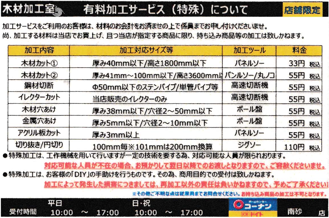 →カットについて→木材カットの注意事項。以前は電動工具レンタルをしていましたが、現在はサービス終了したようです。