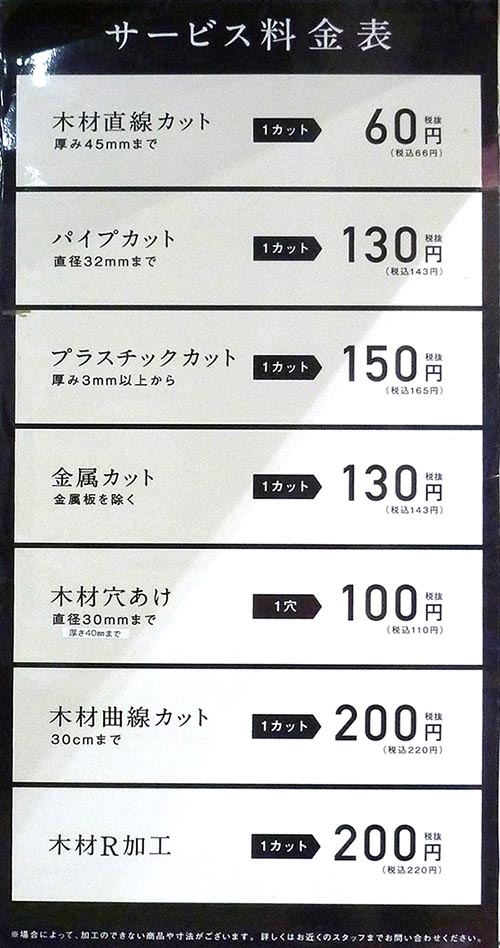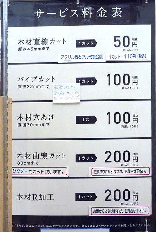 東京東部の各ホームセンター工作室加工料金とレンタル工具料金。