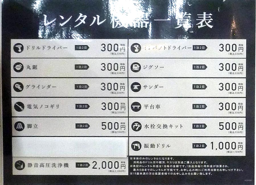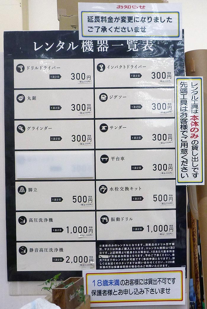 レンタル工具→レンタル工具申し込み注意事項 それにしても、板橋前野店の案内板は特に汚らしいなぁ。(苦笑