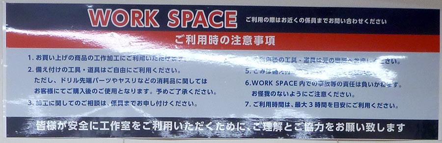 八潮店の工作室はどんなもんかいな、と店内を散策してみましたが工作室が見当たりません。諦めて店から出たら、ありましたよ。注意事項