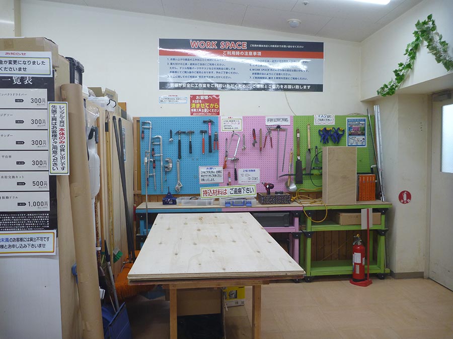 客が利用できる工作スペース。結構広く、電動工具やDIY関連書籍も用意されていて充実度ブッチギリのNo.1!